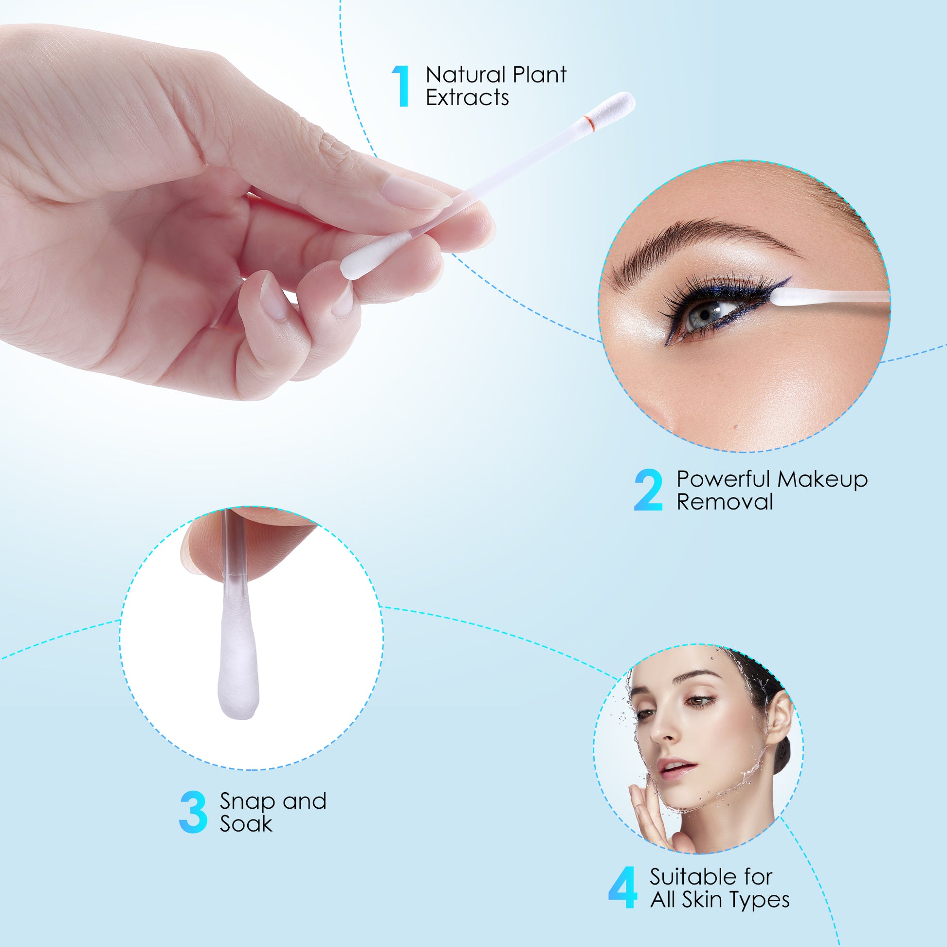 The Loffeyo Makeup Remover Cotton Swabs offer a convenient and effective solution for daily makeup correction and cleansing. Each box contains 50 portable swabs, perfect for maintaining a flawless look on the go. Infused with natural plant extracts like Peony Root, Licorice Root, and Gentian Root, these swabs gently nourish your skin while efficiently removing even waterproof makeup. The innovative snap-to-activate design allows for easy release of 0.15g of makeup remover liquid, which quickly saturates the cotton tip for precise and thorough cleansing. With a leak-proof design, they are safe to carry in your bag without worrying about spills. Gentle enough for sensitive skin and delicate areas like the eyes, these swabs make makeup removal quick, easy, and non-irritating, whether at home, while traveling, or in a professional setting